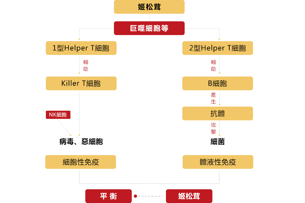 經長時間多方面的研究報告顯示,姬松茸除了具有刺激巨噬細胞作用、增強免疫系統的活性外,還有調節免疫系統的平衡作用。